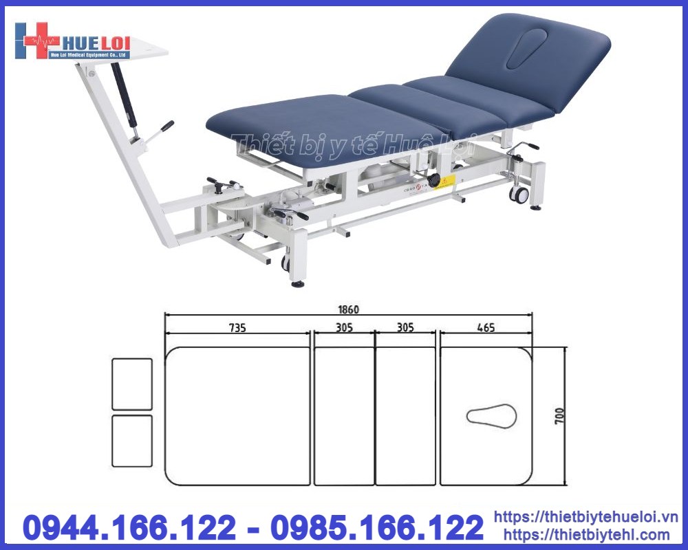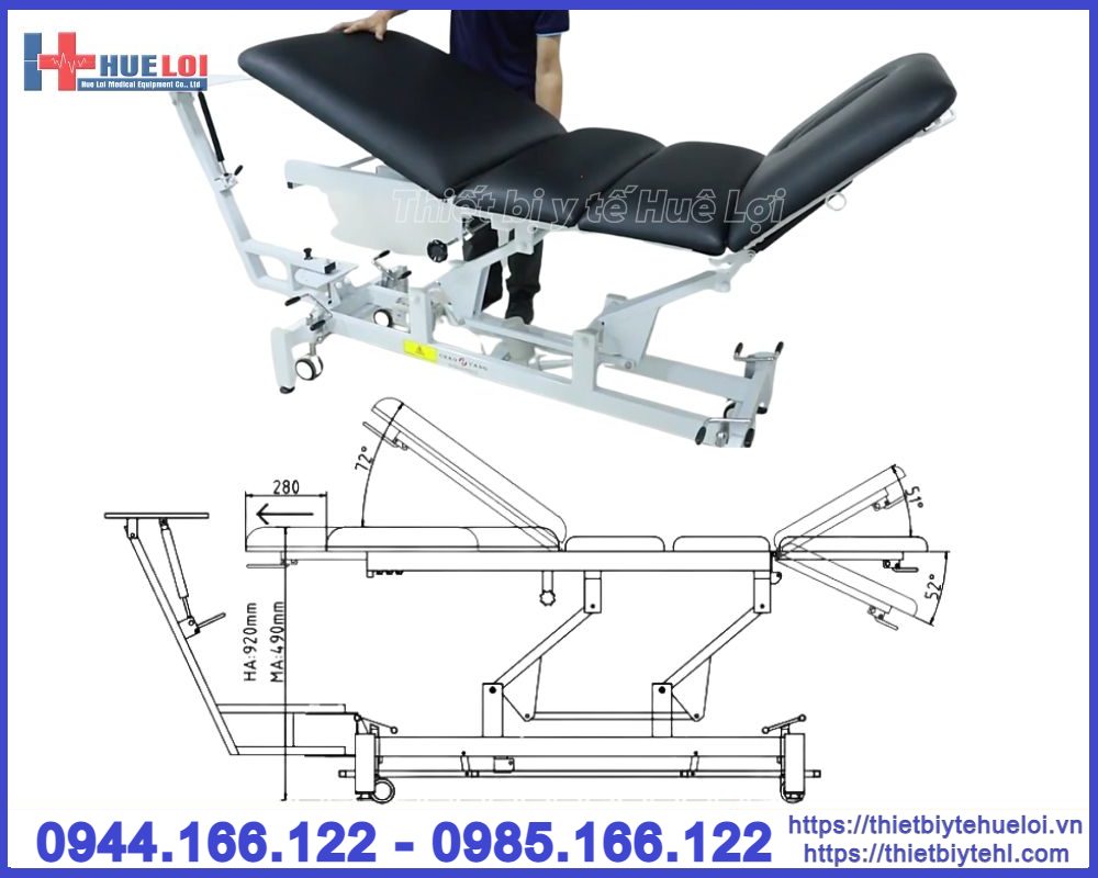 - Giường được chia làm 4 phần, với các góc độ nâng hạ linh hoạt phù hợp với nhiều tư thế điều trị khác nhau